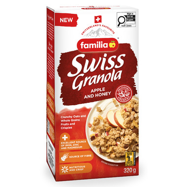 Bio-Familia's Swiss Granola Apple and Honey. Crunchy oats and whole grains fruits and crispies.