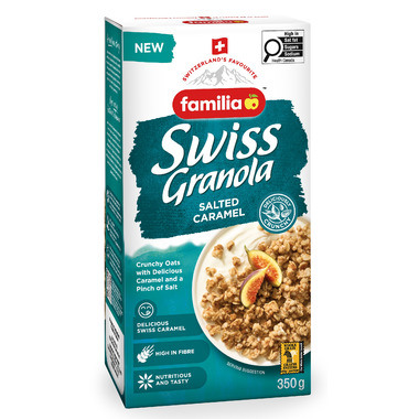 Bio Familia's Swiss Granola Salted Caramel. Crunchy oats with delicious caramel and a pinch of salt.