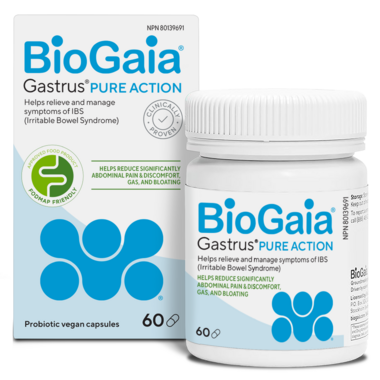 BioGaia Gastrus Pure Action is the only FODMAP-friendly probiotic containing two distinct and patented Limosilactobacillus reuteri strains (DSM 17938 and ATCC PTA 6475), clinically shown to survive gastric transit and colonize the gut to support gastrointestinal health.