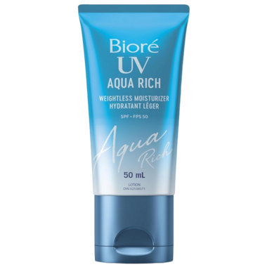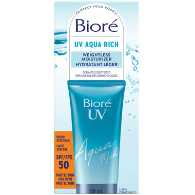 Biore UV Aqua Rich Weightless Moisturizer with SPF 50 provides all day visible moisture and helps protect your skin from UV rays, without clogging pores or feeling heavy.
