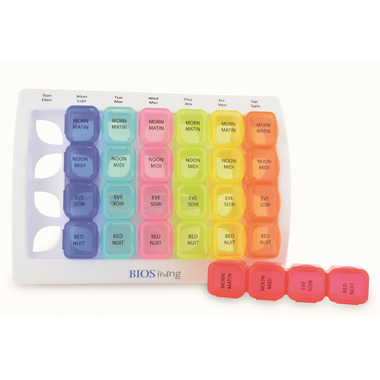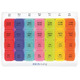 Easily remember to take your pills by using this 7 day colour coded pill organizer. Each days clear plastic pill container has four hinged compartments labelled with the dosage time of day: morn, noon, eve, and bed. Included are stickers for labelling and a convenient storage tray.
