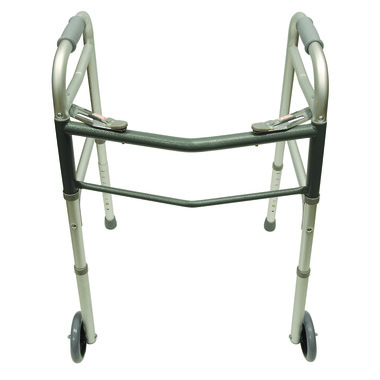The double button collapsible walker is designed for people that require extra stability and support. Its unique U-shaped design allows users to bring the walker close, to assist in standing. Comfortable hand grips, adjustable height, lightweight aluminum construction, 5" (13 cm) wheels and rubber feet make this walker an ideal choice for mobility needs. Weight capacity: 220 lbs (100 kg).