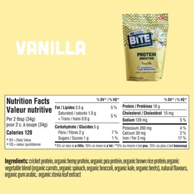 Cricket protein, organic hemp protein, organic pea protein, organic brown rice protein, organic vegetable blend (organic carrots, organic spinach, organic broccoli, organic kale, organic beets), natural flavours, organic gum arabic, organic stevia leaf extract