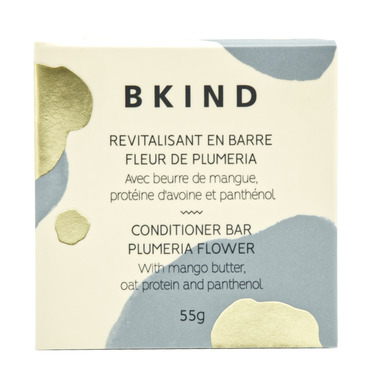 Conditioner bar for hydrated, healthy and frizz-free hair. It is recommended for frizzy and curly hair as it is BKIND's  most hydrating conditioner bar! Used after their Plumeria flower shampoo bar, this conditioner makes hair easier to disentangle and leaves hair shiny and healthy; the hair is therefore easier to comb.