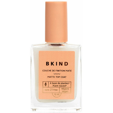 Perfect matte finish. BKIND vegan, 72% plant-based, 21-FREE and fast drying top coat adds a perfect matte finish to your manicure or pedicure and hides imperfections. It also contains a UV inhibitor which prevents yellowing.