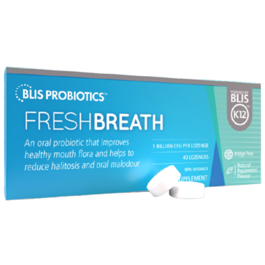 Extra strength probiotic to promote and maintain fresh breath. FreshBreath with BLIS K12® is an advanced oral probiotic that helps to restore a healthy bacterial balance in the oral cavity to reduce oral malodour. Each lozenge contains high dose of BLIS K12® (not less than 1 billion colony forming units (CFU) at the end of shelf-life) so you know you are giving yourself the very best probiotic support to promote fresh breath.