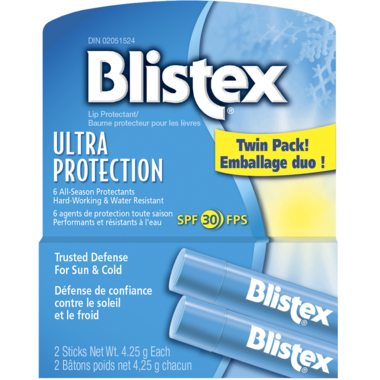 Blistex Ultra Protection lip balm provides 6 protectants to defend your lips from natures harshest elements in any season. Six all-season protectants in a hard-working formula provide trusted defense for your lips against sun and cold. Water resistant. SPF 30