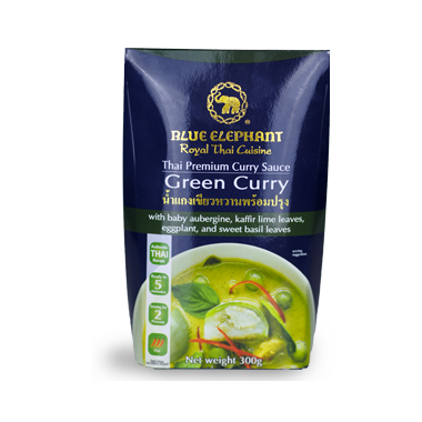 Blue Elephant's Premium Green Curry Sauce is made with baby aubergines, kaffir lime leaves, eggplants, and sweet basil leaves.