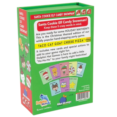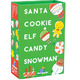 The holiday version of everybody’s favourite game! Each player takes a turn flipping a card while saying one of the five words in the title (in order). If the card flipped matches the word the player says, every player slaps the pile. The last person to slap the pile takes the cards. The winner is the player to lose all their cards first.