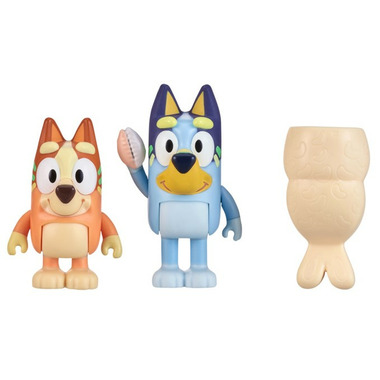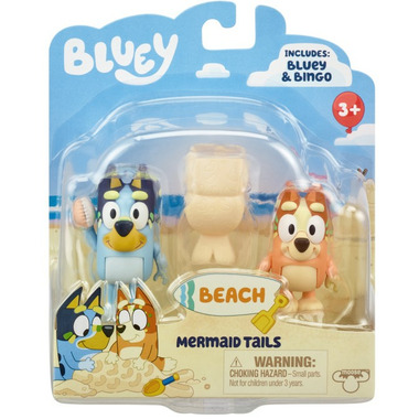 Play out your favorite Bluey adventures with all new styles in the figure 2-packs. Join the Heeler Family for a day at the Beach! The Mermaid pack includes Bluey and Bingo in their new with sunscreen deco and seashell accessories plus a snap on mermaid tail. The Beach Day Play pack showcases Chili and Bingo all dressed up for a day at the beach. Bingo has her new swimsuit and Chili is ready for the sun with her hat and beach bag. Assortment included Bluey Figure 2pk Mermaid, Bluey Figure 2pk Beach & Bluey Figure Action Hero Bluey & Bingo.