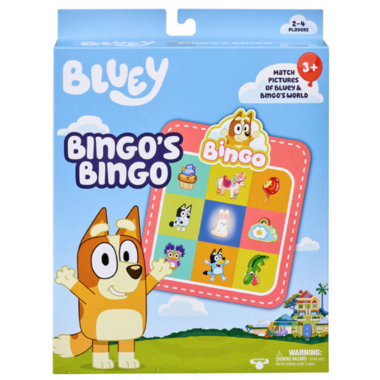 Bluey is a loveable, six-year-old Blue Heeler dog, who loves to turn everyday family life into endless, playful adventures. She loves to create and play unique games with her family and friends and now kids can too with Bingo's Bingo! Match pictures of Bluey and Bingo's world! Call out the images on the Calling Cards. When an images matches your Bingo Card place a Bingo Chip over it. The first player to get three Chips in a row on their card and yell BINGO wins the round and a Scoring Chip. Win three Scoring Chips and you win the game! Bingo's Bingo is an exciting and fun game for anyone aged three and up! For two to four players.