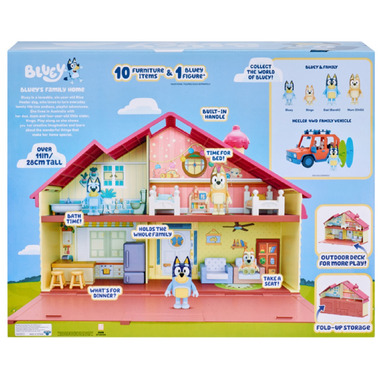 Meet Bluey! A loveable, six-year-old Blue Heeler dog, whose everyday family life becomes a playful adventure. Recreate some of the most memorable moments from the show in the Bluey Family Home playset! Big in size and features, this enormous toy playset is full moulded details with opening doors. and a large wall panel that pulls down to form an amazing outdoor patio!