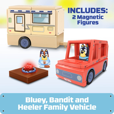 Welcome to Tile Town – where every build sparks a new adventure! Now your child can take a road trip with Bluey and Bandit with the Tile Town Bluey Heeler Camper Tile Set. Tile Town is unlike any other magnetic building set on the market as it empowers kids to create their own Bluey stories, turning each playtime into an exciting journey of building and imagination. Kids will love to CLICK, BUILD, PLAY! CLICK the magnetic tiles together, BUILD fun, interactive sets and PLAY as they create their own adventures! Based around the Bluey episode ""Camping"", children will love building the Heeler 4WD and trailer that can hold Bluey, Bandit and 2 other magnetic figures!