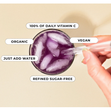Blackcurrant butterfly pea elixir that includes 30 servings. Just add water.