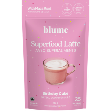 Blume Superfood Birthday Cake Latte Mix. Why wait for your birthday to have cake? Take yourself back to a simpler time, when food was unprocessed and ingredients were whole. Indulge in this Birthday Cake Latte, minus the sugar rush or crash. Kid-you will love the flavour. Grown-up-you will love the maca boost and only 1g of sugar.