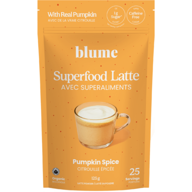 Blume Superfood Pumpkin Spice Latte Blend. Easy as pie. Say hello to falls best friend. Organic pumpkin and maple combine in a warming cup of velvety goodness. Put your feet up, get comfortable and stay awhile. Add to milk, smoothies, oatmeal or really anything.