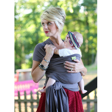 wrap-style baby carrier is free of buckles, straps and snaps and ties up