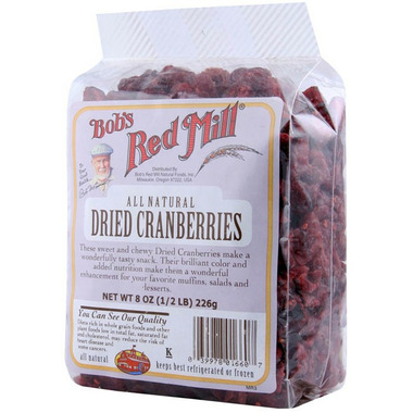 Bob's Red Mill Dried Cranberries are slightly tart, moist, and chewy. Bob's Red Mill Dried Cranberries delights can be used in waffles, cereals, muffins, cookies, and salads. Just a bit of sugar is added as a preservative and to control the tartness.