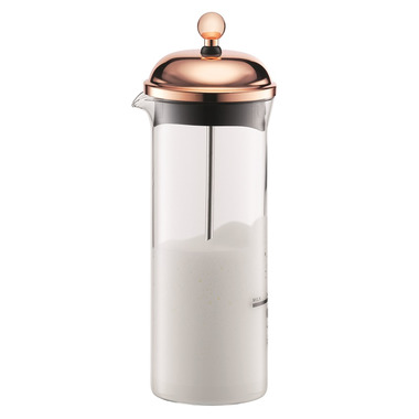 Just pour cold milk (skim, 1 or 2% fat) in the glass jug and move the plunger up and down a few times. You’re rewarded with the most luscious foam imaginable. If you like your foam hot, just put the glass jug with the foamed milk into the microwave for about 30 seconds.