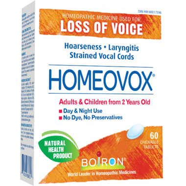 Boiron Homeovox is homeopathic medicine used for the relief of hoarseness, loss of voice, laryngitis and strained vocal cords.