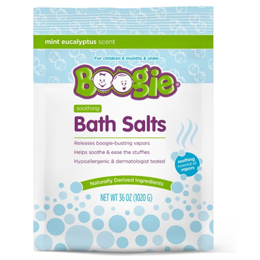 Make the most out of bathtime with Boogie Soothing Bath Salts -- they help soothe, comfort and relieve your little one when congestion, cold, flu and allergy symptoms are at their worst. Our gentle, soothing and naturally-derived bath salts release boogie-busing vapors and are made with essential oils and without menthol, parabens and phthalates. TheyΒre hypoallergenic, dermatologist tested, dissolve cleanly and are suggested for children 6+ months. From the makers of Boogie Wipes saline nose wipes. The Boogieή brand was invented by Moms for Moms with the mission of making parenting easier (and cleaner!) for everyone. From our line-up of natural saline products that help gently clean and dissolve boogers and snot, to our soothing diaper rash cream that you can spray -- we keep the tiniest bodies and booties covered with great products that you and your baby will love. From the bottom of our hearts - Welcome to the Boogie Family! Made with love in the USA and distributed by ELEEO BRANDS.