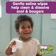 • GENTLE SALINE WIPES FOR STUFFY NOSES: Boogie Wipes saline nose wipes are wet wipes made with natural saline, which is gentle on skin, helps clean and dissolve snot and boogers, and wipes away dirt and germs. They?re gentle enough to be used on noses, faces, fingers and toes whenever cleaning is necessary.