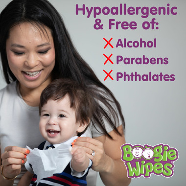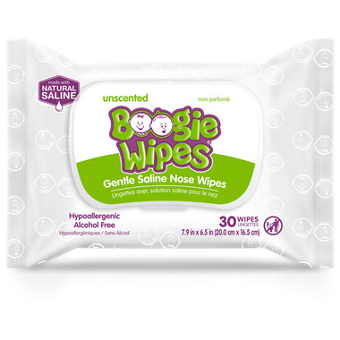 Boogie Wipes saline nose wipes are made with a patented, non-medicated natural and sterile saline formula, which dissolves kids' dried boogers and helps provide relief during cold, flu and allergy seasons and everyday irritation. Recommended by parents and pediatricians alike, Boogie Wipes are a gentle, easy alternative to dry tissues and can soothe even the most tender and sensitive noses. Since they are made with natural saline, these wipes are great for all ages - from congested infants and newborns to stuffy toddlers, even grown adults!