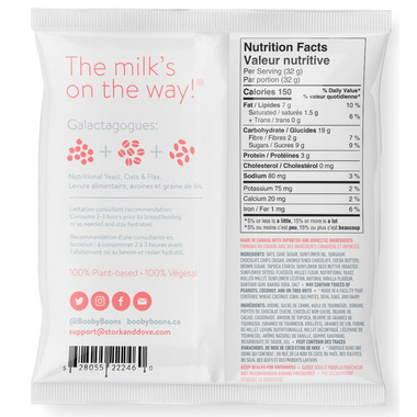 Achieve you breastfeeding goals with BOONS+ Chocolate Chip Lactation Bites. This milk enhancing product is specially made to support breast milk production without interfering with your busy life as a new mom. Each 32 gram bag of Boons+ٙ lactation cookie bites is filled with functional and delicious, bite sized cookies that are packed with 100% plant-based (eggs & dairy-free!!) ingredients that support lactation. Simply tuck one of these in your bag and enjoy your day.