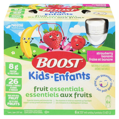BOOST Kids Fruit Essentials Strawberry Banana is a ready-to-drink nutritional supplement designed for kids aged 4 to 12 years. Made with real fruit, it combines strawberry, banana and apple pures for a delicious beverage your kids will love. Packed with 8g of protein and 26 essential vitamins and minerals, this drink complements your childs diet, providing extra nutrition as a snack or a top-up after a meal. It helps build and repair tissues, supports muscle development, and contributes to strong bones and teeth with calcium and other key nutrients. BOOST Kids Fruit Essentials Strawberry Banana is a convenient and tasty treat for your child that supports their growth and development.