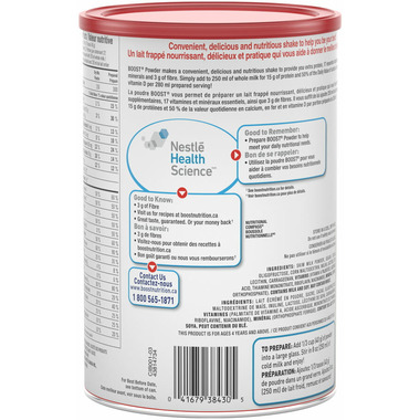 Boost Powder Drink Mix makes 22 servings. When mixed with milk, each serving contains 15g of protein, 17 minerals and vitamins, 50% calcium, and 3g of fibre. Prepare Boost Powder to help meet your daily nutritional needs. Certified Kosher.