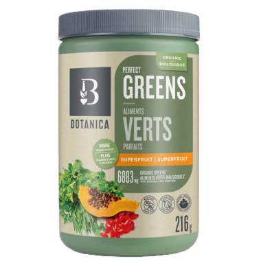 Now with more greens per serving! Botanica Perfect Greens is a tropical fruit-flavoured organic greens powder blend of chlorella, spirulina, and leafy greens to help ensure that you're getting your daily greens. Made in small batches right here in Canada, without any fillers, additives or artificial ingredients. An easy boost of nutrition to your day, providing fibre and key minerals like iron, calcium, and potassium from whole food sources, not synthetically derived. Made without herbal extracts, these greens are safe for the whole family to use.