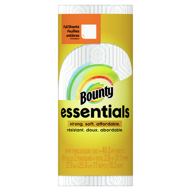 Cheap stuff not holding up? That's why there's Bounty Essentials, where performance meets affordability. This pack contains Bounty Essentials full size white paper towels that are strong enough to handle multiple messes and soft enough to use on your family. And each full size sheet is made to tackle full size messes. Pack contains 1 Regular roll of white Bounty Essentials paper towels. The right price for your family. Performance you can rely on. Full size sheet for larger messes.