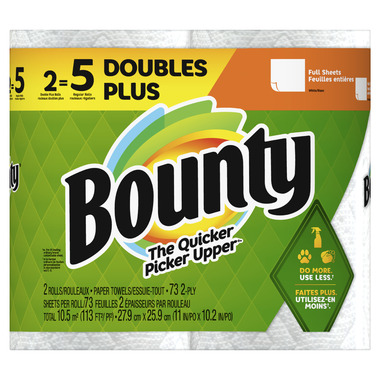 Spilled your drink? Quick! The Quicker Picker Upper. Be ready to tackle messes and spills with Bounty Paper Towels! Each sheet is more absorbent, so you can use less and pick up spills and messes quicker than the leading ordinary brand. That's why Bounty is the Quicker Picker Upper! Bounty Paper Towels are available in two sheet sizes, Full Sheet and Select-A-Size, so you can choose which option works best for you. Bounty Select-A-Size towels are versatile, so you can choose your sheet size depending on your mess.