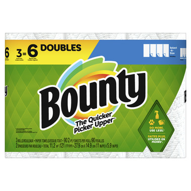 Spilled your drink? Quick! The Quicker Picker Upper. Be ready to tackle messes and spills with Bounty Paper Towels! Each sheet is more absorbent, so you can use less and pick up spills and messes quicker than the leading ordinary brand. That's why Bounty is the Quicker Picker Upper! Bounty Paper Towels are available in two sheet sizes, Full Sheet and Select-A-Size, so you can choose which option works best for you. Bounty Select-A-Size towels are versatile, so you can choose your sheet size depending on your mess.