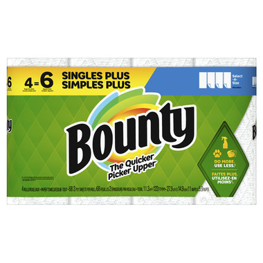 Spilled your drink? Quick! The Quicker Picker Upper. Be ready to tackle messes and spills with Bounty Paper Towels! Each sheet is more absorbent, so you can use less and pick up spills and messes quicker than the leading ordinary brand. That's why Bounty is the Quicker Picker Upper! Bounty Paper Towels are available in two sheet sizes, Full Sheet and Select-A-Size, so you can choose which option works best for you. Bounty Select-A-Size towels are versatile, so you can choose your sheet size depending on your mess.