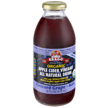 Serving health since 1912 – Bragg Organic Raw Apple Cider Vinegar drink in Concord Grape Acai made with “world famous’ Bragg Organic Apple Cider Vinegar.