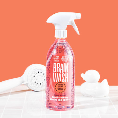 Remove soap scum, body oils, mineral deposits, mold/mildew from shower walls, tub surfaces, restroom tiles and floors, ceramic, plastic, porcelain, chrome and stainless steel with Brain Wash Bathroom Cleaner Bottle + Pod. Each bottle already contains its own cleaning pod.