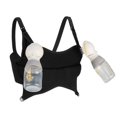 - Outer layer with nursing clips fully drops down for easy pumping access. Pumping configuration holds bottles, wearable pumps and collection cups in place. Easy hands-free pumping