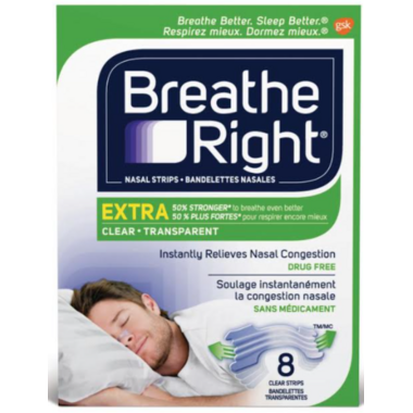 Nasal congestion (or a blocked nose) can make you breathe through your mouth instead of your nose which may cause snoring and a bad night’s sleep for you and your partner. Breathe Right Extra Clear is for sensitive skin and the extra band makes it 50% stronger than Breathe Clear to help you breathe even better. Breathe Right nasal strips gently open your nasal passages, helping you breathe better by providing temporary relief from nasal congestion and stuffiness caused by colds and allergies. Each drug-free nasal strip consists of flexible “spring-like” bands that when placed correctly across the nose, gently opens the nasal passages to make breathing easier.
