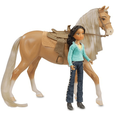 Reenact your favourite scenes from the all-new DreamWorks series Spirit Riding Free with Breyer's fun set from the horse experts at Breyer! This toy set features Chica Linda, a 1:12 scale 7.5" tall palomino horse with a brushable mane and tail. Pru is fully poseable and stands 5.75" tall, and can ride her beloved palomino horse Chica Linda! Included are Chica Linda's saddle, bridle, and saddle pad, so all that's needed is your imagination! Also includes a brush so horse lovers can care for Chica Linda's lovely mane and tail.