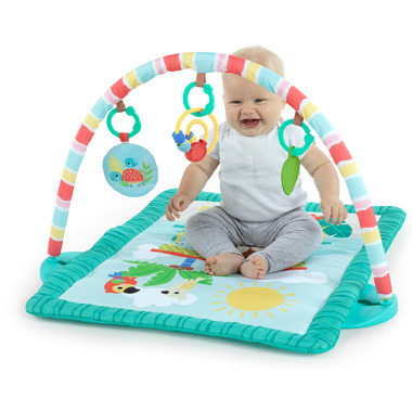 Tummy time feels like a vacation with this totally tropical mat! The Tiki Toy Bar Activity Gym from Bright Starts is packed with playtime fun for different ages and stages. There are 3 ways to play: tummy time, lay & play or sit & play! The toy bar canopy dangles activity toys for baby to lay back and reach or sit and play as she develops. Practice fine motor skills with the bead chaser toy, touch and squeeze the crinkle medallion, and explore every detail of the textured leaf toy. When playtime is over, this compact mat is easy to fold and store. It’s a forecast of sunny skies and smiles with this tiki mat!