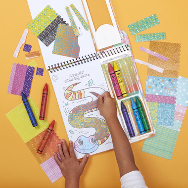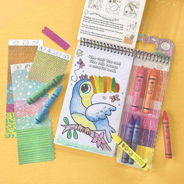 Travel art set designed for young children, featuring a jungle theme with activities like coloring, drawing, tracing, and collaging.The set includes chunky crayons, sticky papers, activity pages, and blank drawing pages in a portable book format, making it ideal for on-the-go creativity!