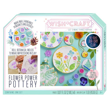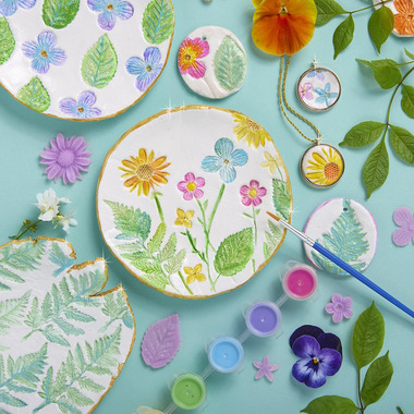Make ceramic jewellery pendants, wall hangings, trinket dishes & more! Roll the included botanical stamps or real leaves and flowers into air dry clay. Paint the flower impressions with pretty colours, metallic gold and glaze for a beautiful finish! Great for ages 8 and up.