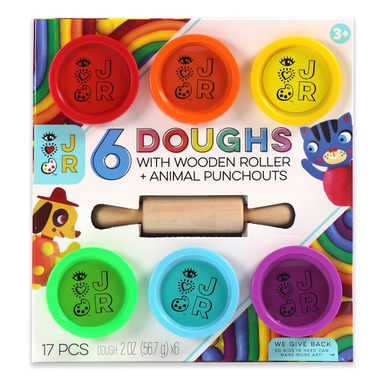 Playing with dough is a classic activity that always brings a smile to kids faces. This high-quality set features a wooden rolling pin, wooden punch outs to make instant animal sculptures and 6 bright colours soft dough.