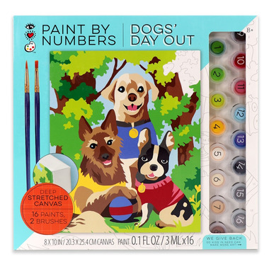 Classic Paint By Numbers, with a joyful, detailed scene suitable for kids 8 years and older. Bright, friendly artwork features 3 dogs in a park. Deep 1.25" canvas can hang or stand. 16 colors of paint and 2 brushes. Tray pulls out to become your work station.