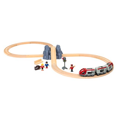 Everything you need to build and play with your first BRIO railway in an ultimate way. Start with a track layout formed like an eight, place the tunnel in the centre so you can go through it and over it. Use the stop and go signal to stop the train and let passengers board the train. If you want to extend your track layout get some extra tracks with the Starter Track Pack. And have more fun.