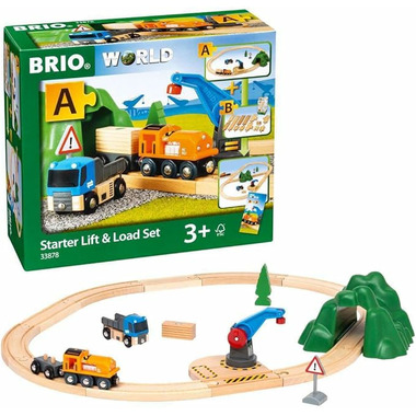 All aboard! Build your first BRIO World with this new lift and load starter set. The layout is packed with machine toys grab crane, truck, a pop-up hood engine and wagon with load ֖ even a warning sign, spruce and a small mountain to thunder through! Lift the cargo off the truck toy with the crane, turn and load onto the train. Works great with all products within BRIO World.