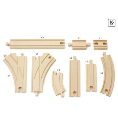 Expand your BRIO world and track layout possibilities with this 16 piece pack of assorted track sections. Made from solid Beech wood and engineered to the exacting standards you'd expect from BRIO, these track sections fit all BRIO railway sets. Sanded smooth and designed to work with all BRIO trains, trucks and cars, this 16 piece assortment includes various lengths of straight and curved track and 2 special switch tracks. The fine craftsmanship and attention to detail assures that all the tracks will fit together easily and snugly for hours of creative and imaginative play.