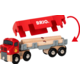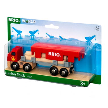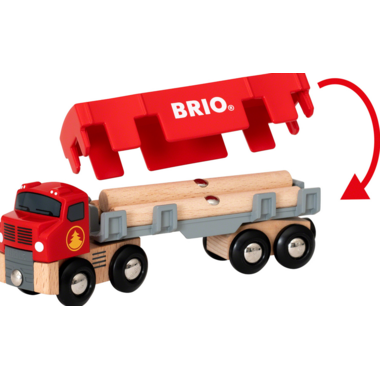 The 33657 Lumber Truck is ready to transport some serious loads across the BRIO World. This long, red semi-truck and detachable trailer features a hidden engine that can be found when the semi-truck cabin is tilted forward, as well as a magnet on the rear of the trailer to connect to any BRIO World wagon. Lift the red trailer cover off to reveal the three wooden log loads stored safely underneath, each with a metallic pin to connect to any magnetic crane in the BRIO World railway.