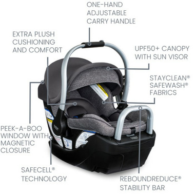 • Ultra-Portable: This baby car seat features an aluminum carry handle that adjusts easily with one hand